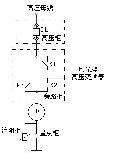 高溫風(fēng)機(jī)原配置帶星點(diǎn)柜配置液阻啟動(dòng)柜,本次改造保留原有星點(diǎn)柜和液阻柜保持不變。需要將星點(diǎn)柜斷路器的一組常開點(diǎn)引至變頻器。需要變頻拖動(dòng)電機(jī)時(shí),液阻柜按原控制方式啟動(dòng)。即上級(jí)高壓開關(guān)柜給變頻器送電后,液阻柜得到開關(guān)柜閉合狀態(tài)信號(hào)后就啟動(dòng)。星點(diǎn)柜閉合后,變頻器檢測(cè)到閉合信號(hào)后方具備開機(jī)條件,然后根據(jù)實(shí)際情況給變頻器啟動(dòng)信號(hào),變頻投入運(yùn)行。工頻運(yùn)行時(shí),閉合K3,斷開K1,K2,液阻柜按原先工頻方式啟動(dòng),完成星點(diǎn)柜和液阻柜的啟動(dòng),達(dá)到電機(jī)軟啟動(dòng)。