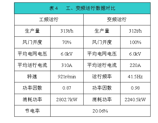 為了對(duì)窯尾高溫風(fēng)機(jī)系統(tǒng)變頻改造后的效果進(jìn)行評(píng)價(jià),在系統(tǒng)投入正常運(yùn)行后對(duì)設(shè)備實(shí)際使用和節(jié)電情況進(jìn)行了測(cè)定和數(shù)據(jù)分析。工、變頻生產(chǎn)工況基本相同,隨機(jī)抽取一個(gè)正常工作日,將系統(tǒng)切換工頻運(yùn)行采用風(fēng)門調(diào)節(jié)風(fēng)量,網(wǎng)側(cè)記錄運(yùn)行數(shù)據(jù),然后將系統(tǒng)切換變頻運(yùn)行,記錄運(yùn)行數(shù)據(jù),具體數(shù)據(jù)如表4所示。