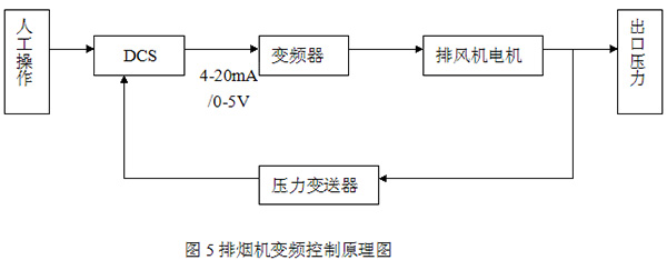 如圖5所示,檢測排煙風機出口煙氣壓力,因為當內(nèi)外壓差太大時,布袋除塵器中的煙氣沒有被除掉,就被直接吸出,影響凈化效果。為了保證煙氣凈化過程順暢進行,DCS接受壓力變送器傳輸過來的壓力信號,按照既定算法進行計算。當壓力超過系統(tǒng)設定值時,DCS發(fā)出4-20mA或0-5V的信號來降低變頻器的頻率,實現(xiàn)排風機降速運行來降低出口煙氣壓力;當壓力低于系統(tǒng)設定值時,DCS發(fā)出4-20mA或0-5V的信號來升高變頻器的頻率,實現(xiàn)排風機升速運行來升高出口煙氣壓力。