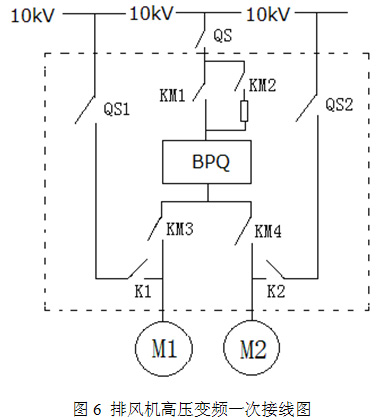 r/min。本系統(tǒng)選用四臺山東新風光電子科技發(fā)展有限公司生產(chǎn)的JD-BP38-560F型高壓變頻器,采用一拖二方案。如圖6所示