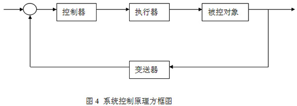 根據(jù)工藝流程,在本系統(tǒng)中,被控對象是核心,被測信號經(jīng)變送器轉(zhuǎn)換成標準信號(4-20mA或0-5V),與給定值進行比較,并對結果進行調(diào)節(jié)運算,以輸出作為控制信號,經(jīng)執(zhí)行器實現(xiàn)對被控對象的調(diào)節(jié)??刂葡到y(tǒng)方框圖如圖4所示: