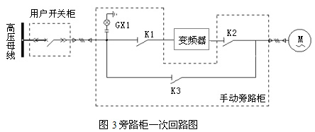 圖3手動旁路柜中,共有3個高壓隔離開關(guān),為了確保不向變頻器輸出端反送電,K2與K3采用電磁互鎖操動機構(gòu),實現(xiàn)電磁互鎖。當K1、K2閉合,K3斷開時,電機變頻運行;當K1、K2斷開,K3閉合時,電機工頻運行,此時變頻器從高壓中隔離出來,便于檢修、維護和調(diào)試。