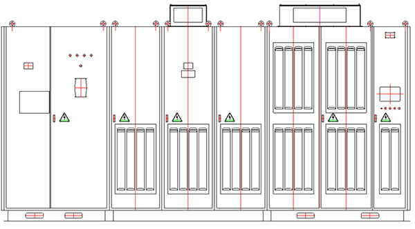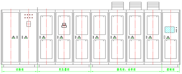 設(shè)計(jì)之初,為保證產(chǎn)品的可靠性、穩(wěn)定性,采用雙重冗余設(shè)計(jì)的模式,即加大了單元的數(shù)量,也增大了各器件的選型。10kV采用每相10個(gè)單元或13個(gè)單元,6kV采用每相6個(gè)單元或8個(gè)單元;功率器件選型余量大至2.5倍甚至3倍,電解電容選擇90-120UF/A,變壓器鐵芯、風(fēng)機(jī)風(fēng)量選型都不同程度的大一規(guī)格。其排布則延續(xù)傳統(tǒng)的排布模式,即從左往右依次為切換柜、變壓器柜、(接線柜)、功率柜、控制柜的模式,其外形如圖(1):