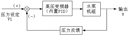 由于永州市零陵區(qū)自來水公司,對(duì)用水負(fù)荷需要在實(shí)際運(yùn)行時(shí)進(jìn)行精確調(diào)整和測(cè)量,因此采用的是恒壓供水系統(tǒng),其工作原理如圖3所示,測(cè)量元件為壓力傳感器,將它設(shè)在水泵機(jī)組出水口,Vi為恒定供水壓力設(shè)定值,供水壓力V作為輸出量,構(gòu)成閉環(huán)控制系統(tǒng)。變頻器內(nèi)部的PLC采集供水壓力值V與用戶給定值Vi進(jìn)行比較和運(yùn)算,通過PID進(jìn)行調(diào)整,將結(jié)果轉(zhuǎn)換為頻率調(diào)節(jié)信號(hào)送至變頻器,直至達(dá)到供水壓力的給定值Vi。不管系統(tǒng)供水流量如何變化,供水壓力值V始終維持在給定壓力值Vi附近。