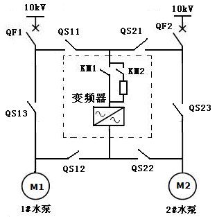 /10kV電機(jī))高壓變頻器,高壓變頻器采用“一拖二”手動(dòng)旁路方案。1#、2#水泵一次系統(tǒng)接線圖路如圖2所示,通過切換高壓隔離開關(guān)把高壓變頻器切換到要運(yùn)行的水泵上去。高壓變頻器可以拖動(dòng)1#供水泵電動(dòng)機(jī)實(shí)現(xiàn)變頻運(yùn)行,也可以通過切換拖動(dòng)2#供水泵電動(dòng)機(jī)實(shí)現(xiàn)變頻運(yùn)行。兩側(cè)供水泵電動(dòng)機(jī)均具備工頻旁路功能。