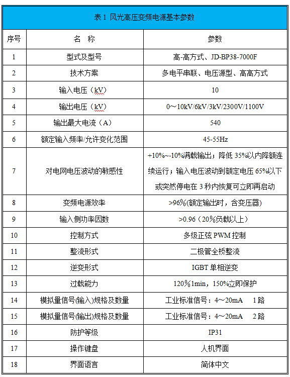 風光高壓變頻電源系統(tǒng),以高可靠性、易操作、高性能為設計目標。高壓變頻電源系統(tǒng)采用新IGBT功率器件,全數(shù)字化微機控制,有關電源基本參數(shù)如表1所示。