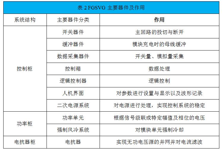 FGSVG系列產(chǎn)品主要分為三部分:控制柜、功率柜、電抗器柜。其中功率柜實(shí)現(xiàn)了統(tǒng)一設(shè)計(jì),方便產(chǎn)品的擴(kuò)展及穩(wěn)定性。各電壓等級(jí)的裝置由控制柜、功率柜及電抗器柜(或空心電抗)組成。各柜體中主要器件及作用如表2所示。