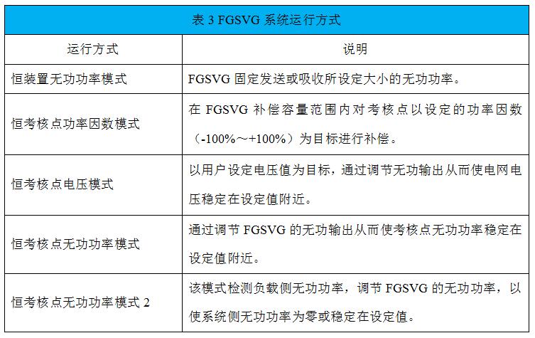 運(yùn)行方式包含了五種:恒裝置無(wú)功功率模式、恒考核點(diǎn)無(wú)功功率模式、恒考核點(diǎn)功率因數(shù)模式、恒考核點(diǎn)電壓模式、恒考核點(diǎn)無(wú)功功率模式2。由下拉框選定,并于右側(cè)設(shè)定目標(biāo)值,目標(biāo)值可隨時(shí)更改,更改后可根據(jù)檢測(cè)值檢查補(bǔ)償效果。如表3所示,對(duì)“運(yùn)行方式”進(jìn)行了詳細(xì)說(shuō)明。