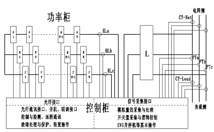 新風光10kV SVG的結(jié)構(gòu)示意圖如圖2所示。主電路采用鏈式串聯(lián)結(jié)構(gòu)設(shè)計,每一相由多個相同的功率單元組成。每個功率單元由多個大功率的電力電子器件組成橋式電路,單元串聯(lián)和載波移相技術(shù)使整機輸出電壓波形更接近于正弦波,避免了大的du/dt所導致的諸多問題。