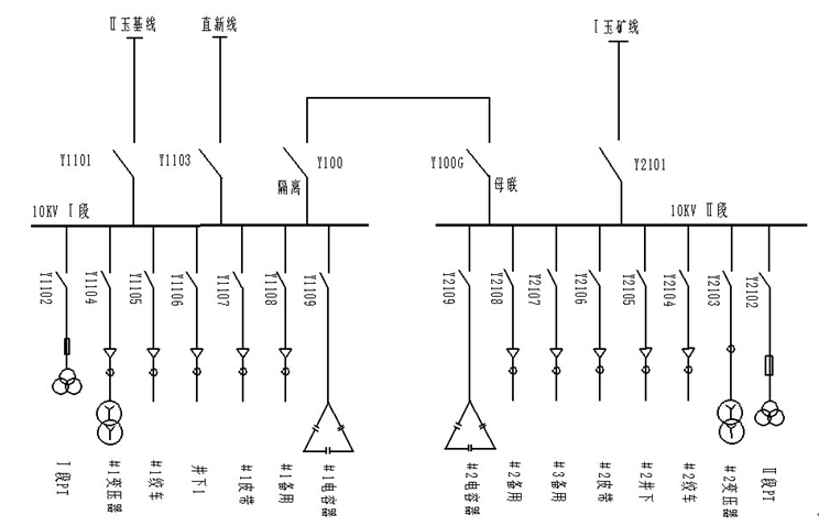 某煤礦礦井供電系統(tǒng)采用10kV雙回路供電,主供線路來(lái)自新玉35kV變電站10kV出線,備用線路來(lái)自自備電廠35kV直供站10kV直新線。井下中央變電所安裝KBSG-630/10變壓器兩臺(tái),供電電壓660V,其供電系統(tǒng)如圖3所示。