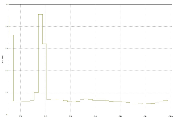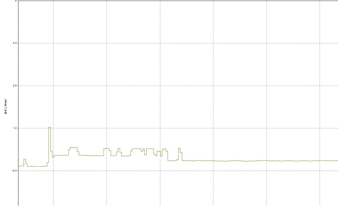 圖9是記錄的10kV1段直新線SVG投運(yùn)前后系統(tǒng)的無(wú)功值,左半部分為SVG未投運(yùn)時(shí)系統(tǒng)的無(wú)功值,可以看出系統(tǒng)無(wú)功值波動(dòng)較大,且最大值到了1.25Mvar;右半部分是SVG投運(yùn)后系統(tǒng)的無(wú)功值,可以看出無(wú)功值近乎為0,較小,且波動(dòng)較小,由此可以看出SVG對(duì)補(bǔ)償系統(tǒng)無(wú)功效果顯著。