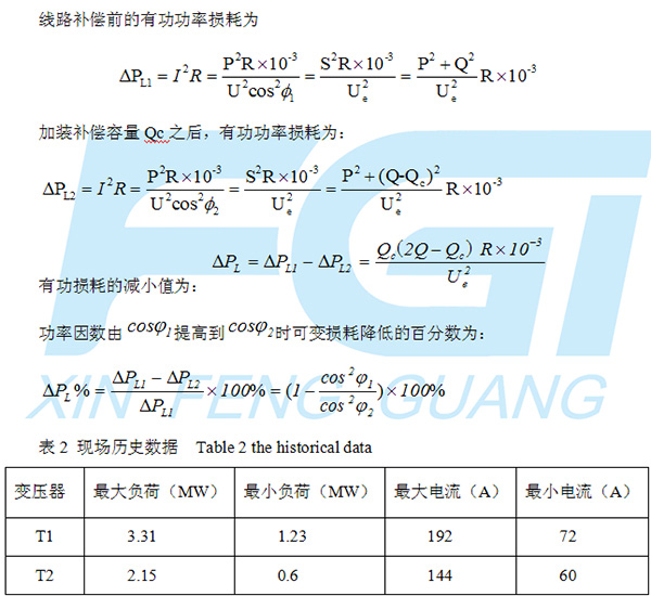 采用固定電容器的無功補(bǔ)償方式后,從現(xiàn)場(chǎng)實(shí)際運(yùn)行的情況來看,電網(wǎng)在重負(fù)荷時(shí)存在“欠補(bǔ)”現(xiàn)象,在低負(fù)荷時(shí)存在著一些無功倒送,即“過補(bǔ)”現(xiàn)象,這樣不僅會(huì)使變壓器二次側(cè)電壓升高,而且還會(huì)使容性無功功率在輸電線路上傳輸,增加電能損耗。