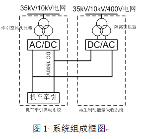 系統(tǒng)組成框圖如圖1所示,現(xiàn)在大部分城市軌道交通牽引所都是35kV或10kV電網(wǎng),經(jīng)過(guò)牽引整流變壓器,再進(jìn)行12脈波整流輸出直流1500V或750V給機(jī)車供電。