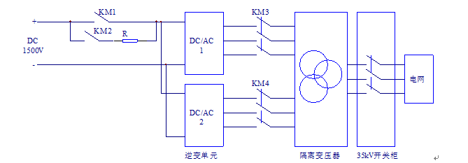 逆變單元輸出交流電壓1000V/500V,經(jīng)隔離變壓器接到35kV/10kV/400V電網(wǎng)。