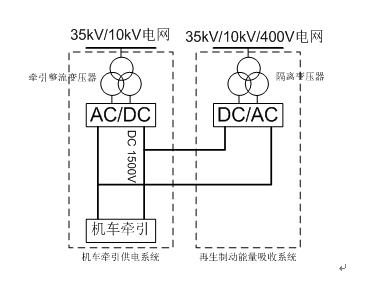 再生制動能量吸收裝置是并聯(lián)在1500V/750V直流系統(tǒng)中,經(jīng)過逆變裝置變成交流,經(jīng)隔離變壓器輸入到電網(wǎng)(35kV/10kV/400V)。